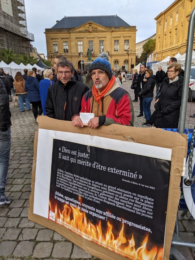 1) Nous nous sommes fait houspiller par un sympathisant de l’extrême droite catholique messine, égaré dans la foule, qui ne comprenait pas notre affiche dénonçant tous les intégristes religieux à l’œuvre dans notre bonne ville.