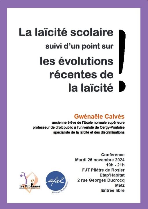 Mardi 28 novembre, Gwénaële Calvès, professeur à l’université de Cergy-Pontoise, membre du Conseil des sages de la Laïcité, est venue à Metz pour une leçon de droit sur la laïcité scolaire que je ne suis pas prêt d’oublier. J’en ai retenu, entre autres, que les lois qui posent les bases de la laïcité scolaire sont antérieures à la loi de 1905.